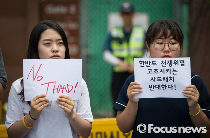 (서울=포커스뉴스) 좋은 대한민국 만들기 대학생 운동본부' 소속 학생들이 15일 오전 서울 용산 미군 기지 앞에서 '사드 배치 반대 48시간 대학생 긴급농성 선포' 기자회견을 열고 있다. 이날 대학생들은 기자회견을 마친 후 용산 미군 기지 2번 게이트 앞에서 48시간 농성에 들어갔다.