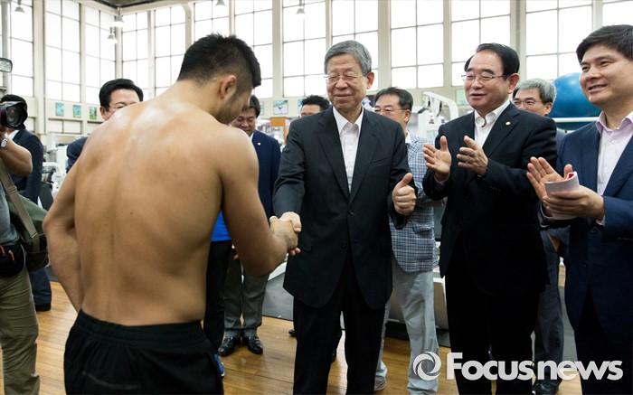 (서울=포커스뉴스) 김희옥 새누리당 혁신비상대책위원장이 15일 오전 서울 노원구 태릉선수촌을 방문해 리우올림픽에 출전하는 선수들을 격려하고 있다.