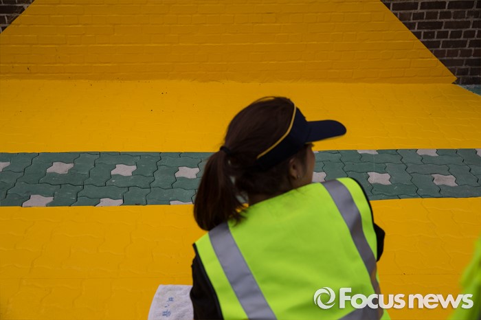 (서울=포커스뉴스) 15일 오전 서울 성북구 안암초등학교 앞에서 열린 아동안전 프로젝트 '옐로 카펫' 제작행사에 참여한 학부모 및 행사 관계자들이 카펫을 설치하고 있다.