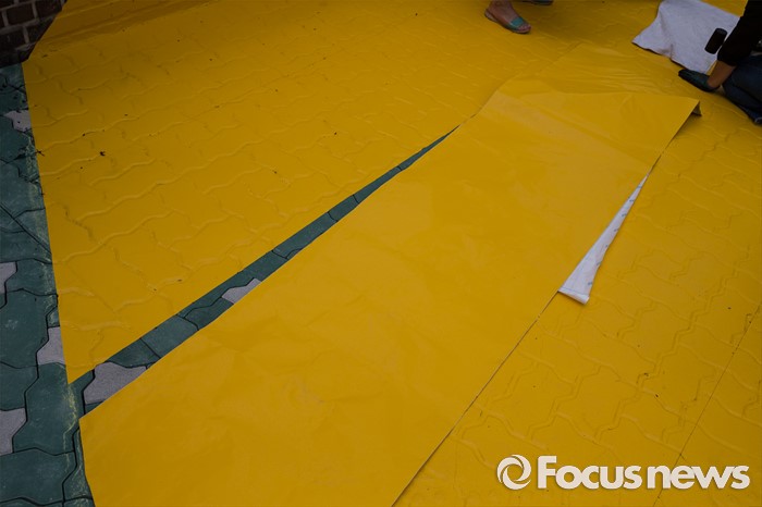 (서울=포커스뉴스) 15일 오전 서울 성북구 안암초등학교 앞에서 열린 아동안전 프로젝트 '옐로카펫' 제작행사에 참여한 학부모 및 행사 관계자들이 카펫을 설치하고 있다.