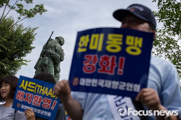 (서울=포커스뉴스) 15일 오전 서울 용산 국방부 앞에서 재향군인회 회원들 및 관계자들이 사드 배치 환영 기자회견을 하고 있다.