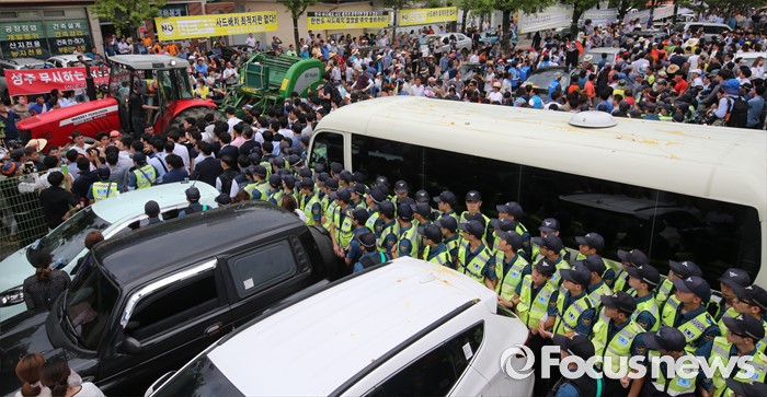 (성주=포커스뉴스) 황교안 국무총리와 한민구 국방부장관이 15일 오전 경북 성주군청광장에서 사드(THAAD, 고고도미사일방어체계) 배치에 대한 주민설명회를 마치고 차량에 오르자 주민들이 트렉터를 동원해 차량을 막고 항의하고 있다.