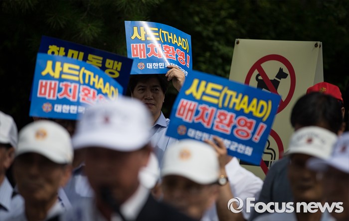 (서울=포커스뉴스) 15일 오전 서울 용산 국방부 앞에서 재향군인회 회원들 및 관계자들이 사드 배치 환영 기자회견을 하고 있다.