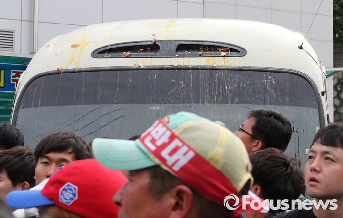 (성주=포커스뉴스) 황교안 국무총리와 한민구 국방부장관이 15일 경북 성주군청광장에서 사드(THAAD, 고고도미사일방어체계) 배치에 대한 주민설명회를 마치고 차량으로 이동하자 주민들이 황 총리가 탑승한 차량에 계란을 던져 계란자국이 보이고 있다.