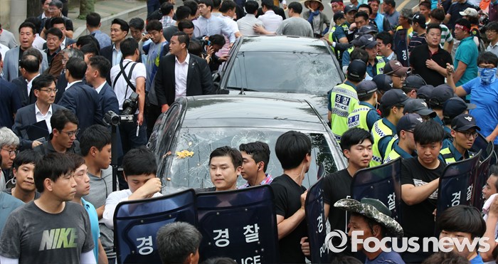 (성주=포커스뉴스) 황교안 국무총리와 한민구 국방부장관이 15일 경북 성주군청광장에서 사드(THAAD, 고고도미사일방어체계) 배치에 대한 주민설명회를 마치고 차량에 갖혀 6시간 넘게 대치중 버스에서 내려 승용차로 빠져나가려 하자 성주 주민들이 총리가 탑승한 차량을 막고 있다.