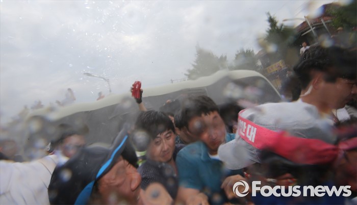 (성주=포커스뉴스) 황교안 국무총리와 한민구 국방부장관이 15일 경북 성주군청광장에서 사드(THAAD, 고고도미사일방어체계) 배치에 대한 주민설명회를 마치고 차량에 갖혀 6시간 넘게 대치중 버스에서 내려 승용차로 빠져나가려 하자 성주 주민들과 경찰이 몸싸움을 하고 있다.