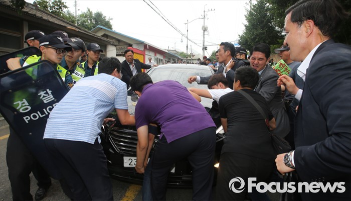 (성주=포커스뉴스) 황교안 국무총리와 한민구 국방부장관이 15일 경북 성주군청광장에서 사드(THAAD, 고고도미사일방어체계) 배치에 대한 주민설명회를 마치고 차량에 갖혀 6시간 넘게 대치중 버스에서 내려 승용차로 빠져나가려 하자 성주 주민들이 총리가 탑승한 차량을 막고 있다.