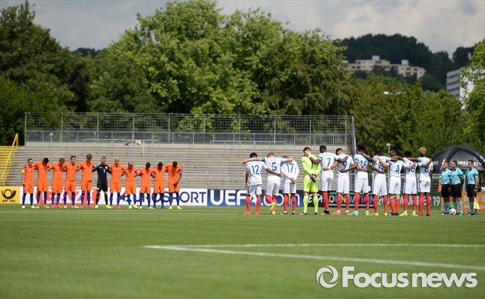 ULM, GERMANY - JULY 15: The teams hold a minutes silence for the victims of Nice terror attack prior to the UEFA Under19 European Championship match between U19 Netherlands and U19 England at Donaustadion on July 15, 2016 in Ulm, Germany. (Photo by Daniel Kopatsch/Bongarts/Getty Images)