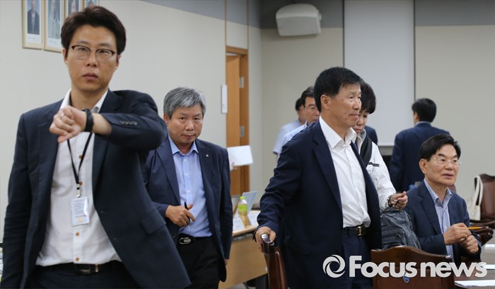 (세종=포커스뉴스) 15일 저녁 세종시 정부세종청사 고용노동부에서 열린 최저임금위원회 제13차 전원회의에서 정회를 마치고 사용자위원들이 자리에 착석하고 있다.