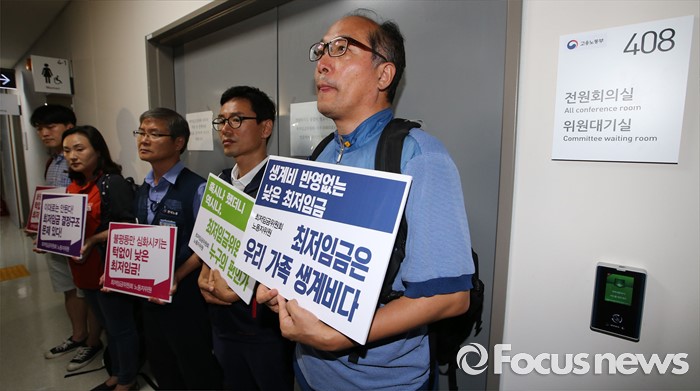 (세종=포커스뉴스) 15일 저녁 세종시 정부세종청사 고용노동부에서 열린 최저임금위원회 제13차 전원회의에서 근로자 위원들이 운영위원회와 논의하지 않은 일방적인 회의 진행으로 심의에 동참할 수 없다고 밝히고 구호를 외치고 있다.