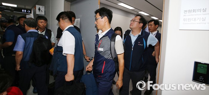 (세종=포커스뉴스) 15일 저녁 세종시 정부세종청사 고용노동부에서 열린 최저임금위원회 제13차 전원회의에서 근로자 위원들이 일방적인 회의 진행에 동참할 수 없다며 회의장을 나서고 있다.