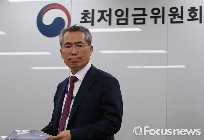 (세종=포커스뉴스) 박준성 최저임금위원회 위원장이 16일 새벽 세종시 정부세종청사 고용노동부 전원회의실에서 열린 제14차 전원회의를 마치고 2017년도 적용될 최저임금안을 발표하기 위해 입장하고 있다. 내년도 최저임금은 7.3% 인상된 6470원에 의결됐다.