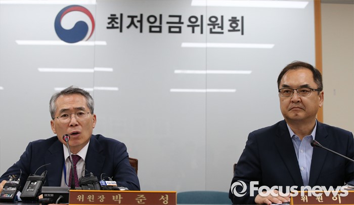 (세종=포커스뉴스) 박준성(왼쪽) 최저임금위원회 위원장이 16일 새벽 세종시 정부세종청사 고용노동부 전원회의실에서 열린 제14차 전원회의를 마치고 2017년도 적용 최저임금안은 7.3% 인상된 6470원에 의결했다고 밝히고 있다.