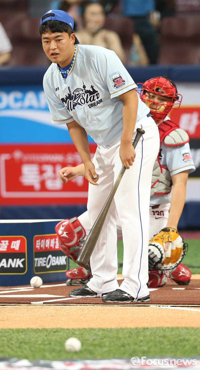 (서울=포커스뉴스) 16일 서울 고척 스카이돔에서 열린 2016 프로야구 올스타 경기에 앞서 가진 번트왕 대회에서 드림팀의 심창민이 표적을 향해 굴러가는 타구를 바라보고 있다.