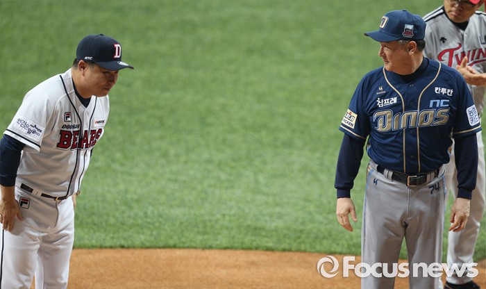 (서울=포커스뉴스) 16일 서울 고척 스카이돔에서 열린 2016 프로야구 올스타 경기에서 드림팀의 김태형 감독이 인사하고 있다. 오른쪽은 나눔팀의 겸경문 감독.