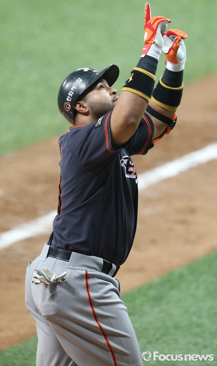 (서울=포커스뉴스) 16일 서울 고척 스카이돔에서 열린 2016 프로야구 올스타 경기에서 나눔팀 로사리오가 2회초 좌월 솔로 홈런을 치고 홈인하며 세리머니를 하고 있다.