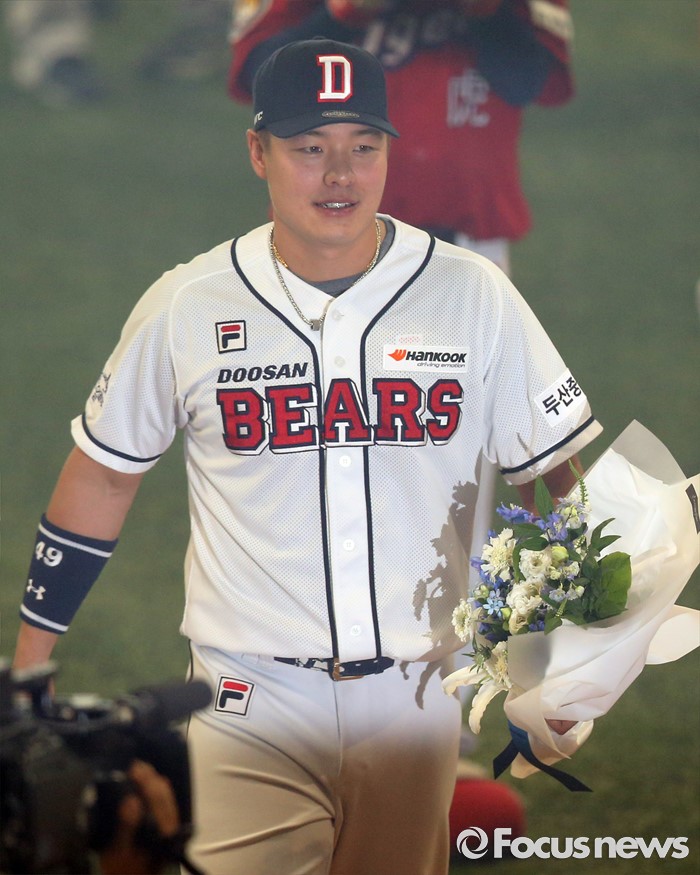 (서울=포커스뉴스) 16일 서울 고척 스카이돔에서 열린 2016 프로야구 올스타전에서 MVP로 선정된 드림팀의 민병헌이 동료들의 꽃다발을 들고 걸어 나오고 있다.