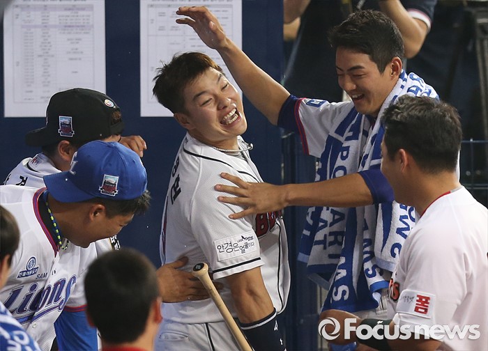 (서울=포커스뉴스) 16일 서울 고척 스카이돔에서 열린 2016 프로야구 올스타 경기 7회말 1사후 드림팀 민병헌이 세 타자 연속 좌월 솔로 홈런을 치고 더그아웃에서 활짝 웃고 있다.