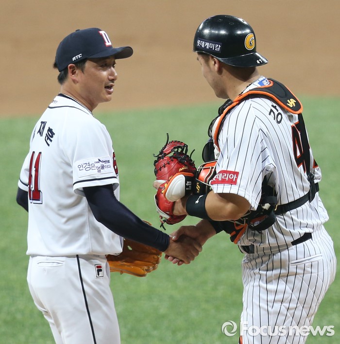 (서울=포커스뉴스) 16일 서울 고척 스카이돔에서 열린 2016 프로야구 올스타 경기 6회초 2사 1루에서 드림팀 투수 정재훈이 마운드에 오르자 포수강민호가 악수하며 환영하고 있다.