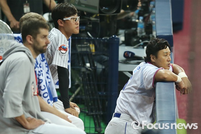 (서울=포커스뉴스) 16일 서울 고척 스카이돔에서 열린 2016 프로야구 올스타 경기에서 지명타자로 출장한 드림팀 이승엽이 더그아웃에서 난간에 턱을 괴고 경기를 관전하고 있다.