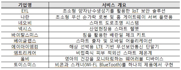 이날 행사에서는 총 10개 국내 IoT 스타트업·중소기업이 제품·서비스를 소개했다. 이들 10개 기업은 이번 쇼케이스 참가 신청을 한 68개 스타트업·중소기업 중에서 IoT 글로벌 민관 협의체 참여 기업 및 민간 전문가들이 아이디어의 사업성, 제품 경쟁력 등을 심사하여 선정했다.