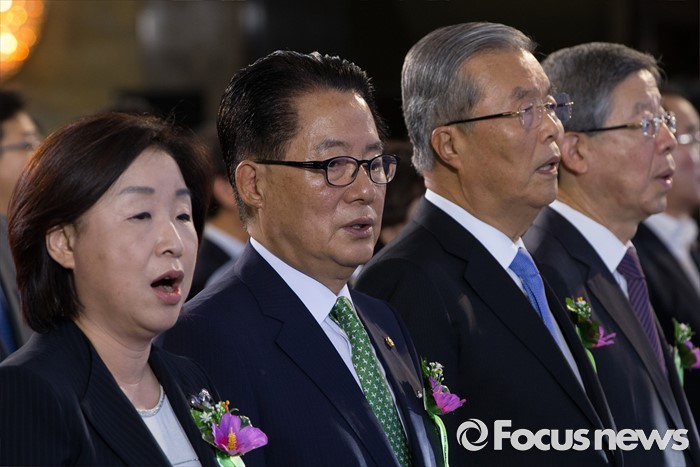 (서울=포커스뉴스) 17일 오전 서울 영등포구 여의도 국회의사당 중앙홀에서 열린 제68주년 제헌절 경축식에 참석한 4당 대표들이 국민의례를 하고 있다. 왼쪽부터 심상정 정의당 대표, 박지원 국민의당 비대위원장, 김종인 더불어민주당 비대위원장, 김희옥 새누리당 비대위원장.
