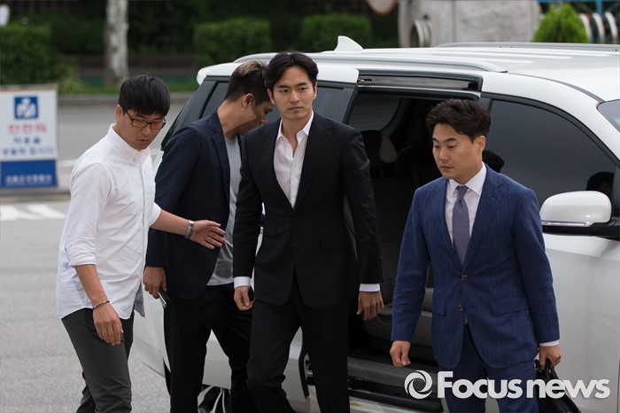 (서울=포커스뉴스) 성폭행 혐의로 피소된 배우 이진욱(가운데)이 17일 오후 서울 강남구 수서경찰서로 출석하고 있다.