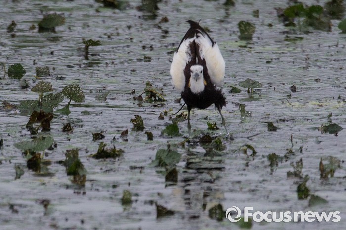 (의왕=포커스뉴스) 경기 의왕시 왕송지에서 물꿩이 연밭을 거닐다 엉덩이를 들고 배설하고 있다. 물꿩은 연밭이나 수초위에서 서식이 적합하도록 발가락이 길게 진화해 수생식물을 자유롭게 헤치고 다닌다.