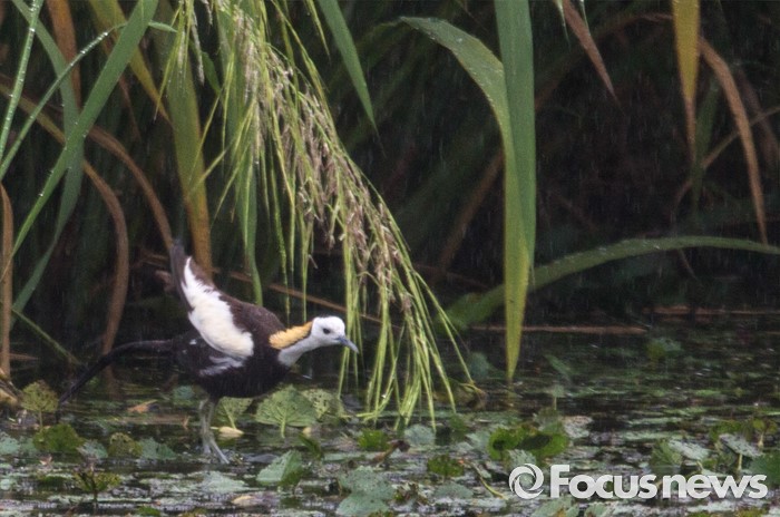 (의왕=포커스뉴스) 아열대성 조류인 물꿩이 경기도 의왕시 왕송지의 갈대밑에서잠시 비를 피하고 있다.