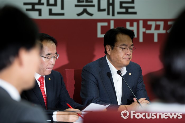 (서울=포커스뉴스) 정진석(왼쪽 세 번째) 새누리당 원내대표가 18일 오전 서울 여의도 새누리당사에서 열린 혁신비상대책위원회의에 참석해 모두발언을 마친 뒤 생각에 잠겨 있다.