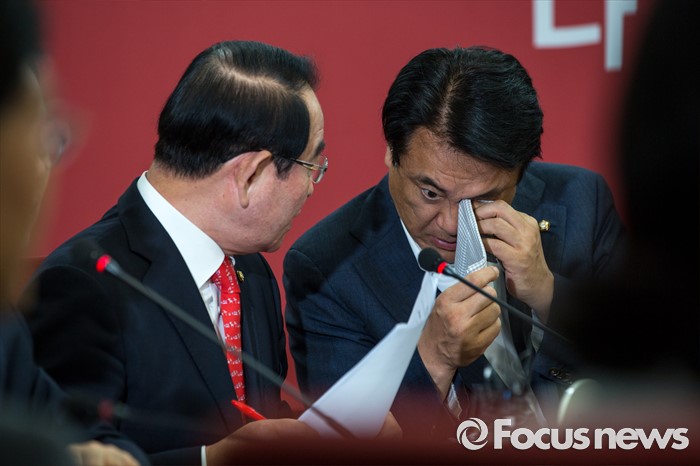 (서울=포커스뉴스) 정진석(오른쪽) 새누리당 원내대표와 박명재 사무총장이 18일 오전 서울 여의도 새누리당사에서 열린 혁신비상대책위원회의에 참석해 대화 하고 있다.