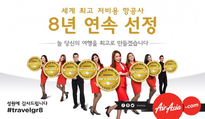 에어아시아는 지난 12일 영국의 항공 전문평가 및 리서치 기관인 스카이트랙스가 주관하는 세계항공대상에서 8년 연속 '세계 최고 저비용항공사상'과 '아시아 최고 저비용항공사상'을 수상했다. 또 계열사인 에어아시아 엑스는 4년 연속 '세계 최고 프리미엄 캐빈 운영 저비용항공사 상'과 '세계 최고 프리미엄 석 운영 저비용항공사 상'을 받았다.에어아시아의 8년 연속 '스카이트랙스 세계항공대상' 수상 기념 특가 항공권 프로모션 포스터 <사진제공=에어아시아>