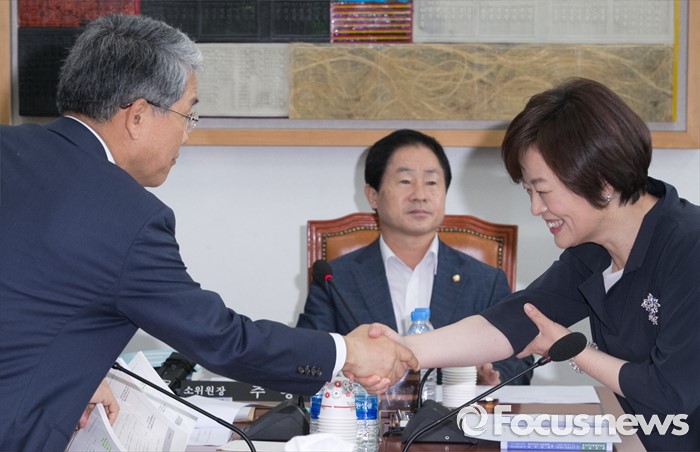 (서울=포커스뉴스) 18일 오전 서울 여의도 국회에서 열린 예산결산특별위원회 결산심사소위원회에 참석한 진선미(오른쪽) 더불어민주당 의원과 김동철(왼쪽) 국민의당 간사가 인사하고 있다. 가운데는 주광덕 소위원장.