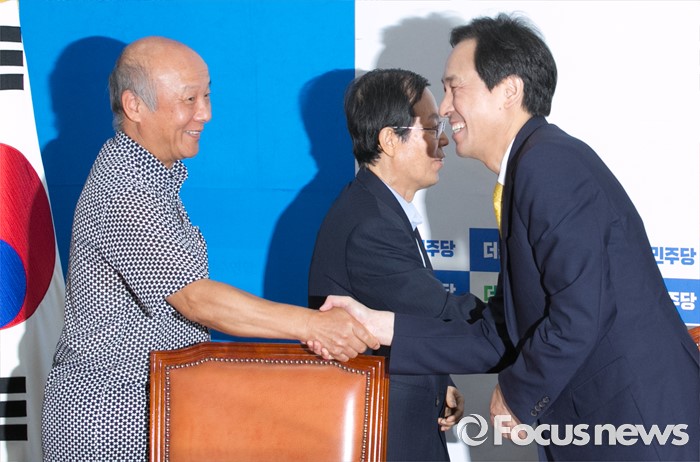 (서울=포커스뉴스) 우상호(오른쪽) 더불어민주당 원내대표가 18일 오전 서울 여의도 국회에서 열린 사드반대 전국대책회의 등 관련단체와의 면담에 참석해 박석운 한국진보연대 상임대표 등 관계자들과 인사하고 있다.