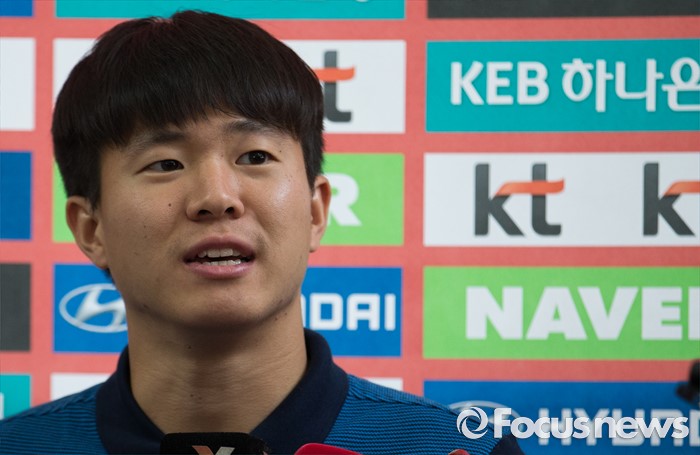 (인천공항=포커스뉴스) 2016년 리우데자네이루 올림픽 메달에 도전하는 올림픽 축구 국가대표팀 권창훈이 18일 오후 인천국제공항에서 브라질 상파울루로 출국하기 전 취재진 질문에 답하고 있다.