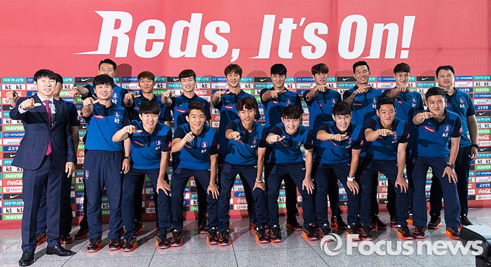 (인천공항=포커스뉴스) 2016년 리우데자네이루 올림픽 메달에 도전하는 올림픽 축구 국가대표팀이 18일 오후 인천국제공항에서 브라질 상파울루로 출국하기 전 기념촬영을 하고 있다.