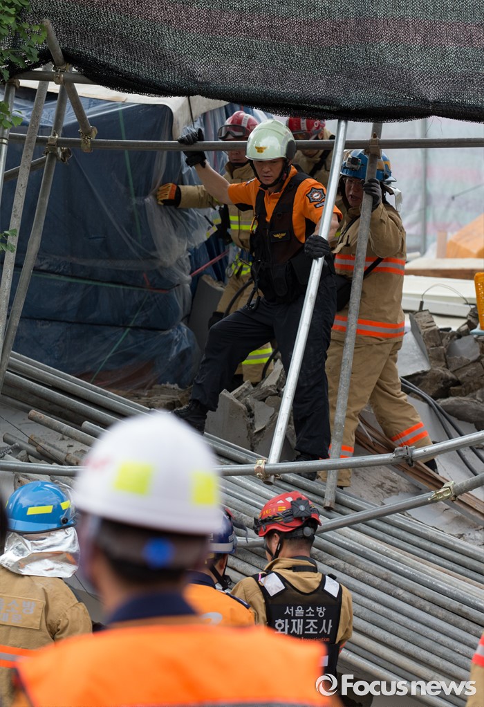 (서울=포커스뉴스) 18일 오후 서울 서대문구 홍은동 한 공사장에서 붕괴사고가 일어나 소방대원들이 구조작업을 벌이고 있다. 소방당국은 붕괴된 건물에 현재 1명이 매몰되어 있다고 밝혔다.