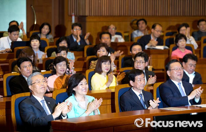 (서울=포커스뉴스) 18일 오후 서울 여의도 국회 헌정기념관에서 한국적 제3의 길 후원으로 열린 '개헌을 말하다 의원 대담, 어떤 헌법인가?'에 참석한 김종인(앞줄 왼쪽부터) 더불어민주당 비대위 대표, 박영선, 진영, 김부겸 의원 등이 박수치고 있다.