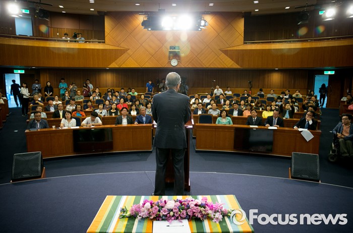 (서울=포커스뉴스) 18일 오후 서울 여의도 국회 헌정기념관에서 한국적 제3의 길 후원으로 열린 '개헌을 말하다 의원 대담, 어떤 헌법인가?'에 참석한 김종인 더불어민주당 비대위 대표가 축사를 하고 있다.