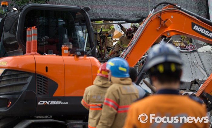 (서울=포커스뉴스) 18일 오후 서울 서대문구 홍은동 한 공사장에서 붕괴사고가 일어나 소방대원들이 구조작업을 벌이고 있다. 소방당국은 붕괴된 건물 지하에 1명이 매몰되어 있다고 밝혔다.
