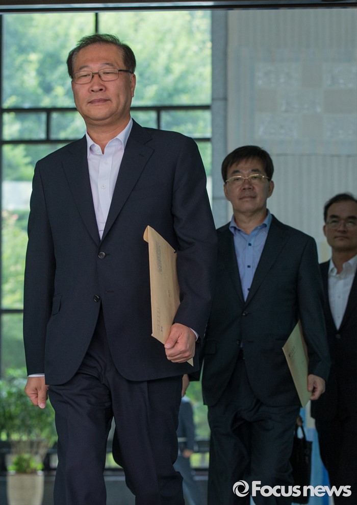 (서울=포커스뉴스) 18일 오후 서울 서초구 대검찰청에서 전국 고검장 간담회가 마친 후 박성재(맨 앞) 서울고검장을 비롯한 전국 고검장들이 청사 밖으로 발걸음을 옮기고 있다. 검찰은 이날 간담회를 통해 진경준 검사장의 뇌물수수 사건과 관련해 일선 검찰청의 의견을 수렴하고 대책을 논의하기로 밝혔으나, 언론에 비공개로 진행했다.