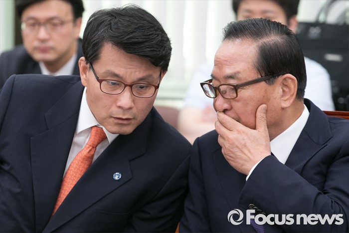 | △ 외통위 참석해 대화하는 서청원-윤상현 |