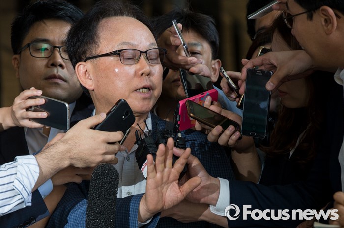 (서울=포커스뉴스) 롯데케미칼 270억원대 소송 사기에 연루된 혐의를 받는 기준 전 롯데물산 사장이 19일 오전 서울중앙지검에 피의자 신분으로 출석, 취재진의 질문에 답하고 있다.