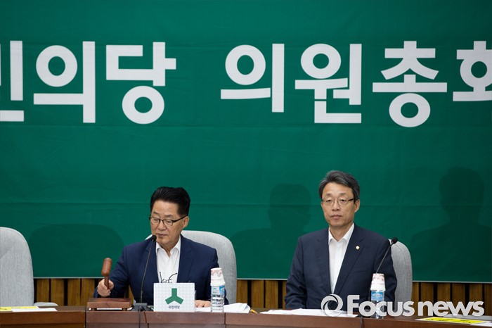 (서울=포커스뉴스) 박지원(왼쪽) 국민의당 비상대책위원장이 19일 오전 서울 여의도 국회에서 열린 의원총회에 참석해 의사봉을 두드리고 있다.