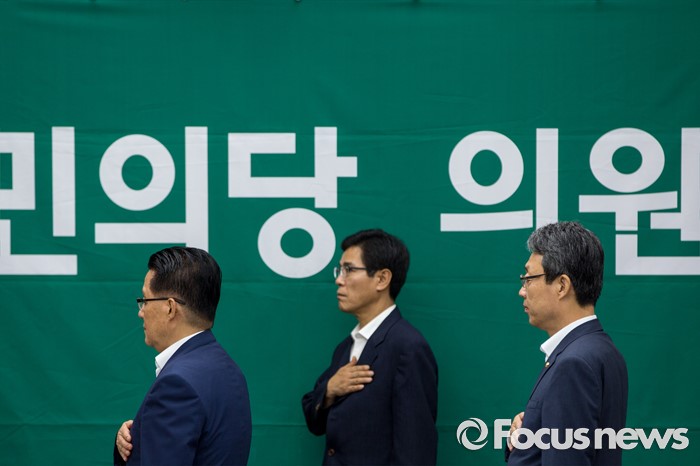 (서울=포커스뉴스) 박지원(왼쪽) 국민의당 비상대책위원장과 김성식 정책위의장과 김성식(오른쪽) 정책위의장이 19일 오전 서울 여의도 국회에서 열린 의원총회에 참석해 국민의례 하고 있다.