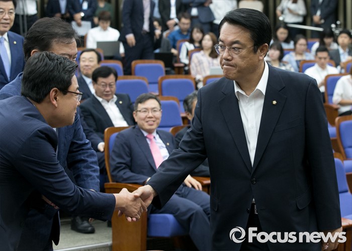 (서울=포커스뉴스) 19일 오전 서울 여의도 국회에서 열린 새누리당 의원총회에 참석한 정진석 원내대표가 동료 의원들과 인사하고 있다.