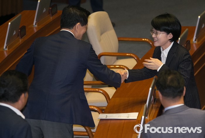 (서울=포커스뉴스) 19일 오전 서울 여의도 국회에서 열린 344회 국회(임시회) 1차 본회의, 사드(THAAD·고고도미사일방어체계) 배치에 대한 긴급현안질문에 참석한 박선숙 국민의당 의원이 동료 의원들과 인사하고 있다.