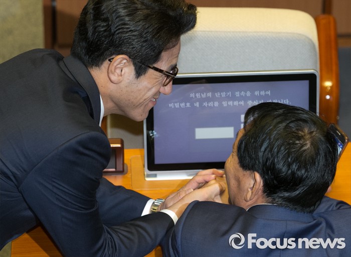 (서울=포커스뉴스) 19일 오전 서울 여의도 국회에서 열린 344회 국회(임시회) 1차 본회의, 사드(THAAD·고고도미사일방어체계) 배치에 대한 긴급현안질문에 참석한 정병국(왼쪽), 안상수 새누리당 의원이 대화하고 있다.