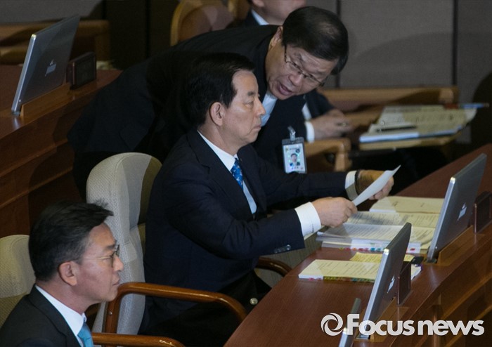 (서울=포커스뉴스) 19일 오전 서울 여의도 국회에서 열린 344회 국회(임시회) 1차 본회의, 사드(THAAD·고고도미사일방어체계) 배치에 대한 긴급현안질문에 참석한 한민구 국방부 장관이 황희종 기획조정실장과 대화하고 있다.