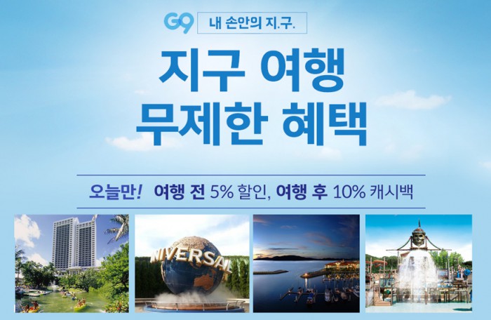 G9는 19일 하루동안 당일 오픈하는 여행상품에 대해 5% 할인쿠폰과 10% 자동 적립 캐시백을 제공한다. 캐시백 적립은 19일 오전 9시부터 20일 오전 9시까지 결제 완료한 고객에게 지급된다.